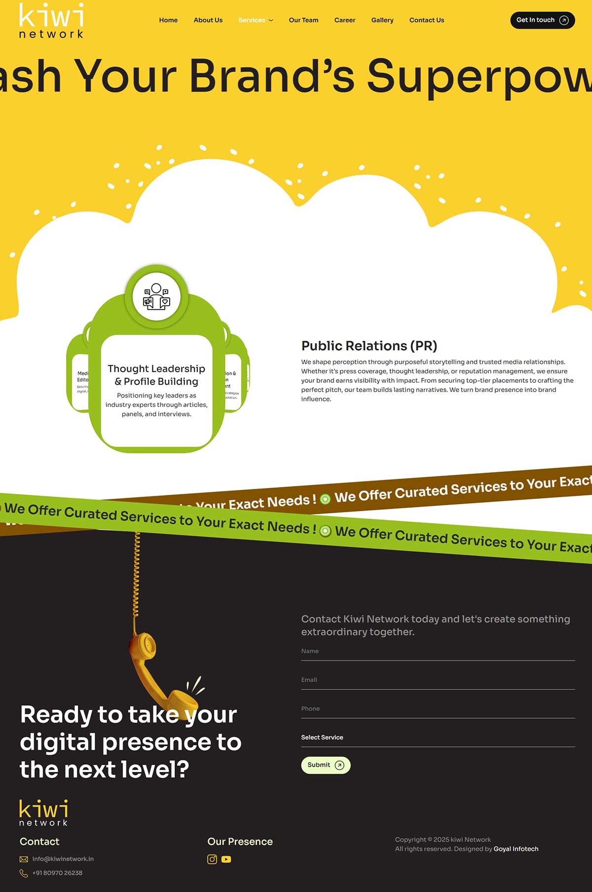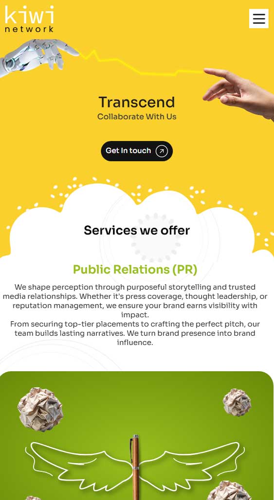 Kiwi Network offers a blend of PR, digital marketing, and social media services. The challenge was organizing this varied portfolio into clear web sections without overwhelming visitors.