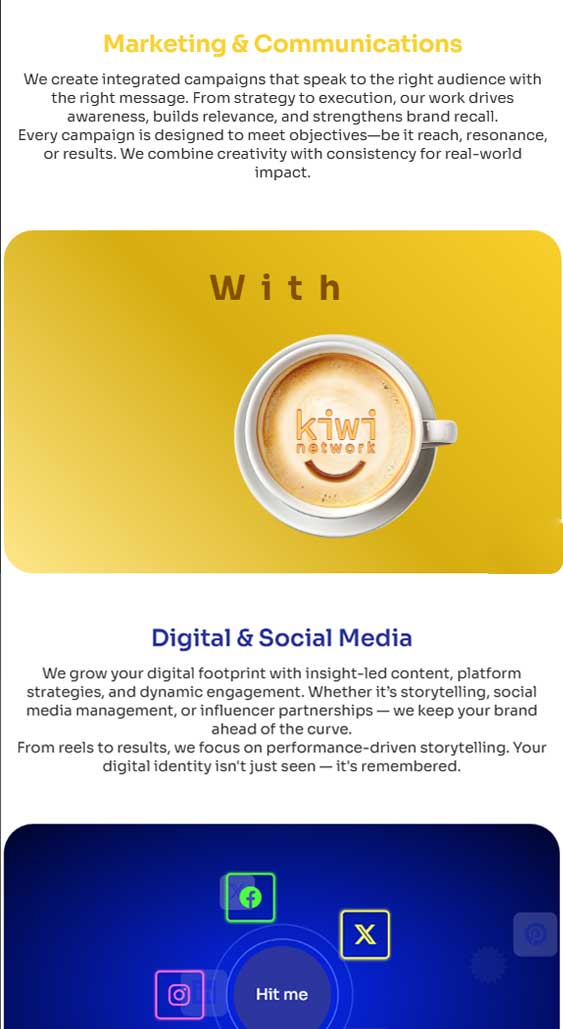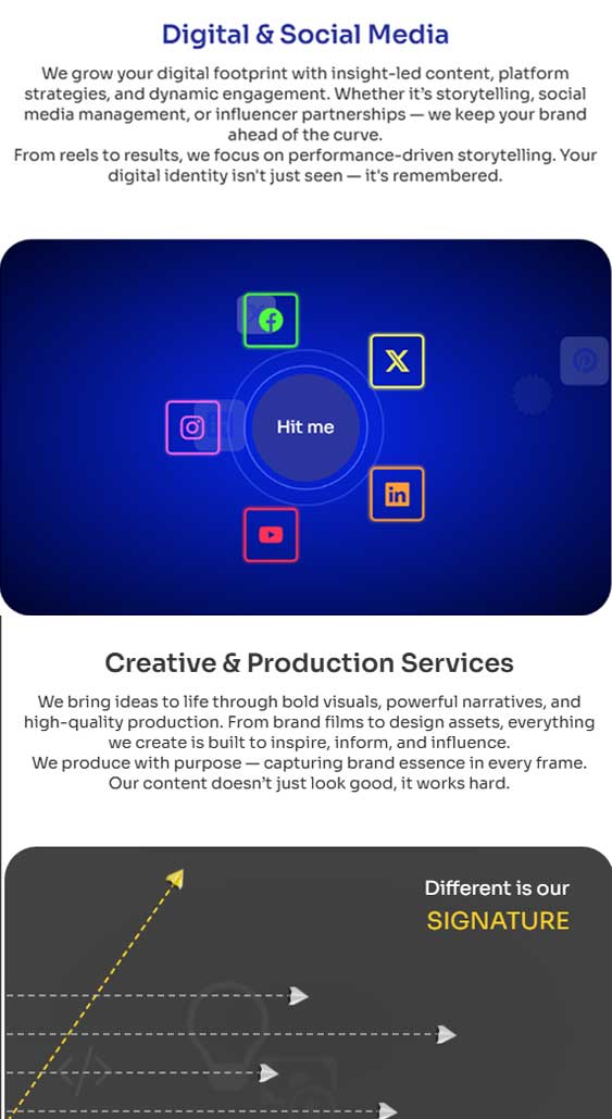 Clear Communication of Services : Each major offering — from PR to digital campaigns to social media solutions — was structured with clear headings, service descriptions, and call-to-action elements to guide users seamlessly.